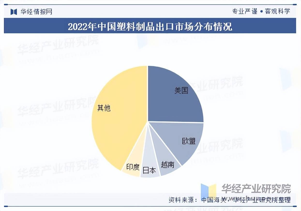 出口市场分布来看,2022年中国塑料制品出口主要集中在欧美和亚洲地区,东南亚、美国和欧盟仍是最大出口市场。此外,美国作为我国塑料制品第一大出口国,2022年的塑料制品出口金额为272.9亿美元,占出口市场比例的25.3%。